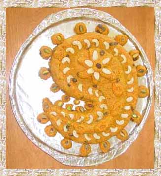 Grate the carrots. You can leave the skins on if washed thoroughly. Dark, organic carrots come closest to the Indian red carrot in a rich, sweet taste. In the tallest cooking pot you have (a foot tall pot to boil pasta in is good)put the carrots, cream and milk. You MUST attend to the pot constantly during this step. Read the whole direction first before cooking. Bring the mix to a boil. It will seem to take forever for the milk to boil, but when it does, you must act quickly. The milk and cream will rise up, bubbling quickly to the top of the pot. As soon as it begins to rise in the pot, remove the pot from the burner, so that the mix will subside before it boils all over. Reduce the burner to a low simmer. Wait for the burner to cool a bit before putting the pot back on, then stir constantly until you are sure it isn't going to come to a boil again. You are after a gentle, small simmer here. Okay, now relax. From this point, you only have to attend the pot intermittently, say every 5 to 10 min. Stir as often as you need to so that the mix doesn't stick to the bottom of the pan. The mix is to be cooked until it is reduced to dry (think damp sand). This takes forever.....hours and hours. Once the mixture is dry, add the gur, almonds and cardamoms. (Use just the seeds from the cardamom pods, slightly crushed.) Stir constantly until the sugar has dissolved and is dispersed throughout the mix. You will be stirring constantly until the end from this step on. Now add the ghee. Stir until it soaks completely in the mix and the mixture begins to clump. Indians will keep adding ghee until no more will soak in. This is far too oily for western taste. Once the pudding is clumping, throw in the nuts and raisons (the amount of raisons is pretty much to taste). Stir well, remove from heat and let cool until it can be handled without burning your hands. Now let your artistic genes run free. This is where the optional stuff comes in. The pudding can be shaped! Make a flower, make anything! In India, finely beaten leaves of silver foil are laid about the top (no they don't taste or feel funny...they just make the sweet look beautiful). This is one of those times a picture is worth a thousand words. Here is the gajar halwa I decorated for my eldest son's wedding: ![]() I've also formed this into a lotus flower, a daisy and on one occasion...a horseshoe crab (don't ask). Just think edible play dough and go for it! |