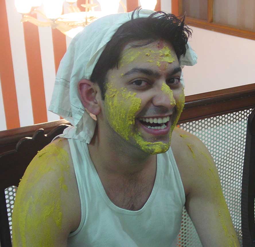 Indians are and always have been fanatical about personal cleanliness. It is not enough for the groom to bathe. He must now be rubbed down with a tumeric mixture by his mother and aunties. This mix not only exfoiliates his skin and gives it a golden glow, but sanitizes it as well. Tumeric is an antiseptic used in food preparation. For instance, fish dusted prepared with tumeric resist the growth of bacteria. Our boy is going to be sqeaky clean and shining for his wedding. |