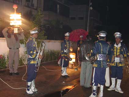 the chandeliers that lead the procession are electric and hooked up to a generator. The band follows. When